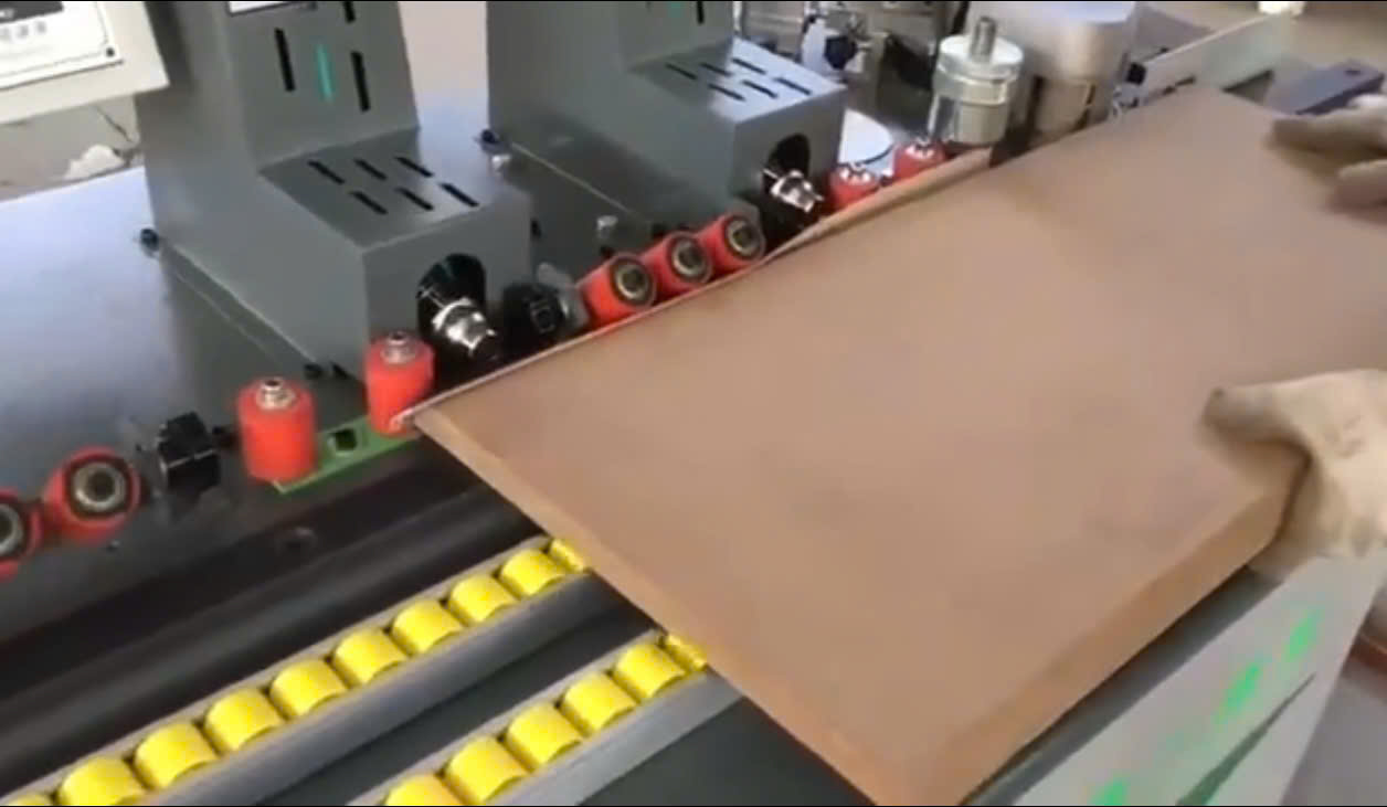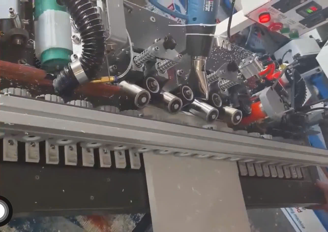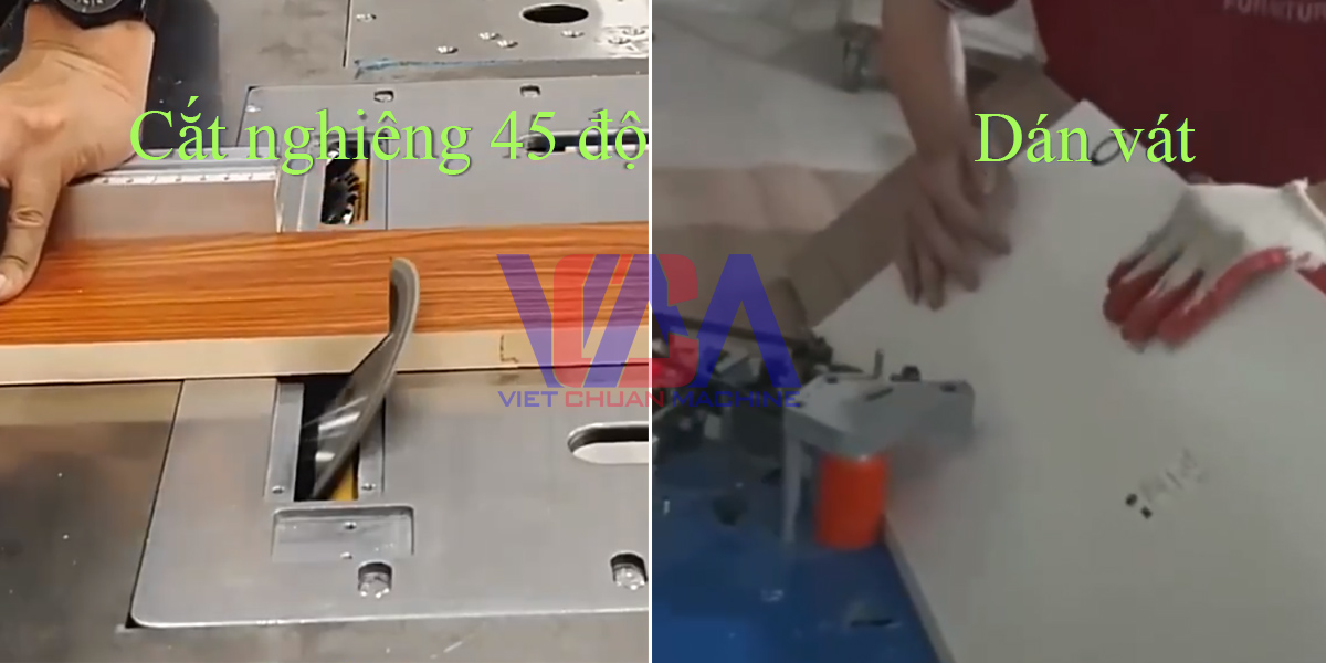 - Máy dán cạnh vát tự động dòng mini: Thiết bị này đã có sẵn cơ cấu xẻ rãnh chỉ nẹp, và hệ thông lô tỳ nghiêng theo cạnh vát, có thêm chức năng phay gọt chỉ thừa trên và dưới. Máy có cơ cấu kẹp phôi và đưa phôi tự động. Yêu cầu tấm ván đã phải được xẻ phần vát chéo trước. Ưu điểm của dòng máy này là đơn giản,  tốc độ dán nhanh. Nhược điểm là phải căn chỉnh đồng bộ kích thước phần vát chéo và vị trí xẻ nẹp để khớp với nhau, máy chỉ gọt được chỉ thừa trên và dưới tấm ván nhưng máy hoạt động thường không ổn định và tốn nhiều công căn chỉnh.